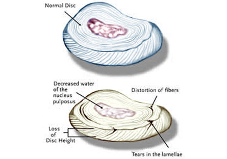 These symptoms are caused by the fact that worn out discs are a source of pain because they do not function as well as they once did, and as they shrink, the space available for the nerve roots also shrinks. As the discs between the intervertebral bodies start to wear out, the entire lumbar spine becomes less flexible. The result can be back pain and stiffness, especially towards the end of the day.